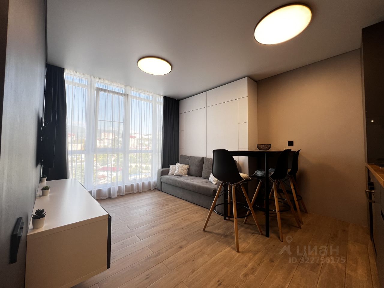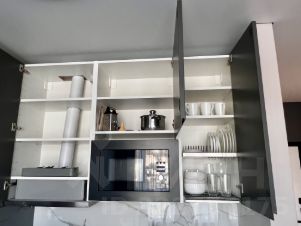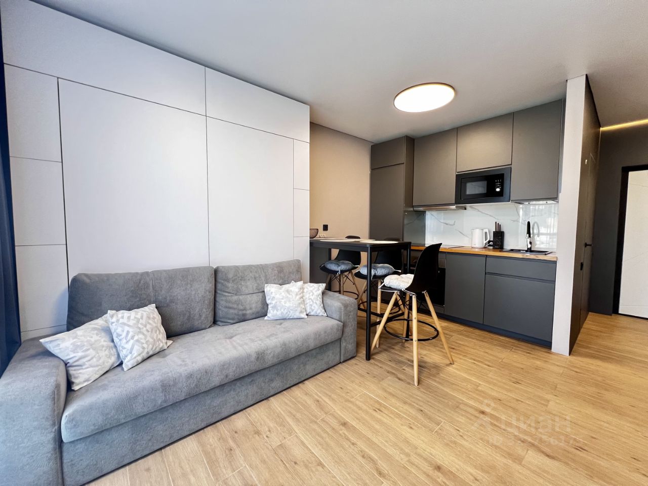 - кухня-гостиная с диваном-трансформером, который раскладывается в полноценную двуспальную кровать с ортопедическим матрасом (на фото), а так же места хранения в этой же системе и кондиционер