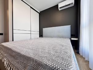- выделена спальня с двуспальной кроватью, ортопедическим матрасом, по обе стороны от кровати есть полочки и над ними розетки с USB, встроенный шкаф, кондиционер