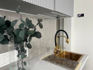 оснащение кухни: индукционная плита, холодильник, эл. чайник, микроволновая печь