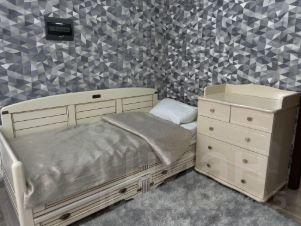 Мебелью: две большие гардеробные, шкаф купе, диван раскладной, зеркало, кровать двуспальная, кровать односпальная, прикроватные тумбочки, 2-умя комодами, большой обеденный стол и стулья.