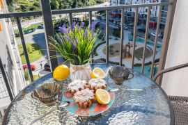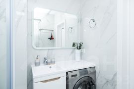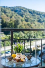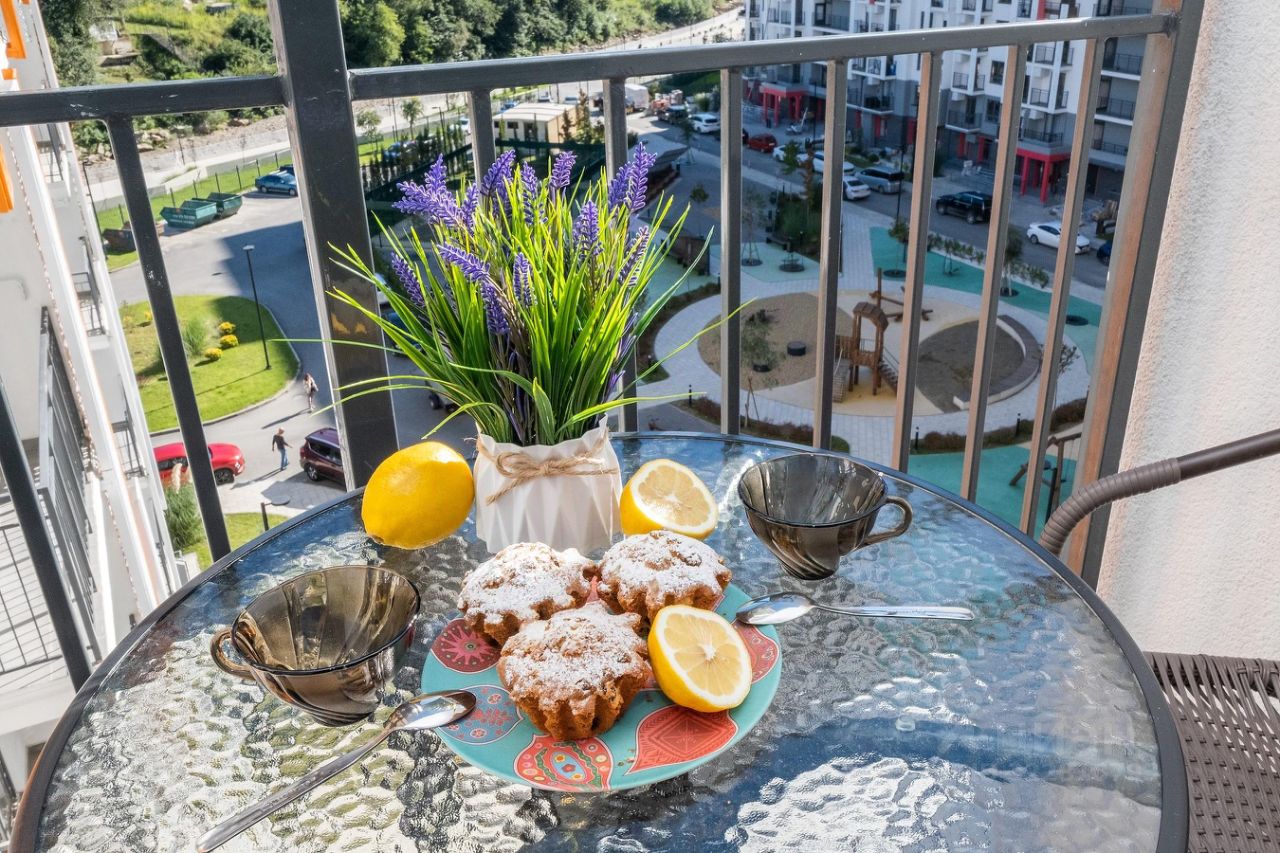 Студия с новым дизайнерским ремонтом, с собственным выходом к речке, с парковкой на территории комплекса и большой детской площадкой.