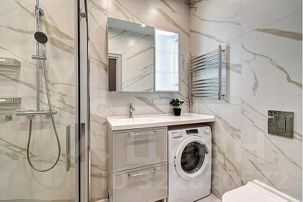 Ванная комната: душевая кабина, стиральная машина, набор косметики (шампунь, гель, мыло), мягкие полотенца