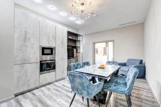3кухня - столовая объединяющая изолированные комнаты . Стол на 6 чел., просторная кухня с полной комплектации посуды и тд. Духовка-холодильник- посудомойка- микроволновка- морозилка- плита . А так же раскладное кресло (75*190) далее коридор с огромным шкафом во всю стену