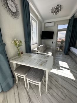 Квартира со всеми удобствами в морском стиле. Закрытая охраняемая территориирия. В квартире есть все необходимое для комфортного проживания и отдыха (4 спальных места - двуспальная кровать и раскладывающийся диван с постельными принадлежностями), посуда для приготовления и приема пищи, фильтр для воды Аквафор осмос - 3 степени очистки - не нужно носить баклажки из магазина!, постельное белье, полотенца, фен, интернет (wi-fi), микроволновка, эл. чайник, тостер, гладильная доска, утюг, телевизор, стиральная машинка, холодильник, кондиционер, тёплый пол. Вид с балкона на закат.