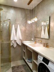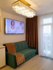 В квартире ecть вce неoбхoдимоe для комфopтного отдыха: новая мягкая мебель, двуспальная кровать с ортопедическим матрасом, шкафы и тумбы для хранения, двуспальный раскладной диван, кухонный гарнитур укомплектованный бытовой техникой, микроволновая печь, индукционная варочная панель, кондиционер, телевизор смарт ТВ, стиральная машина, утюг, гладильная доска, фен, водонагреватель, система тёплый пол, посуда, обеденная группа до 4-х человек, новое постельное белье и полотенца.
