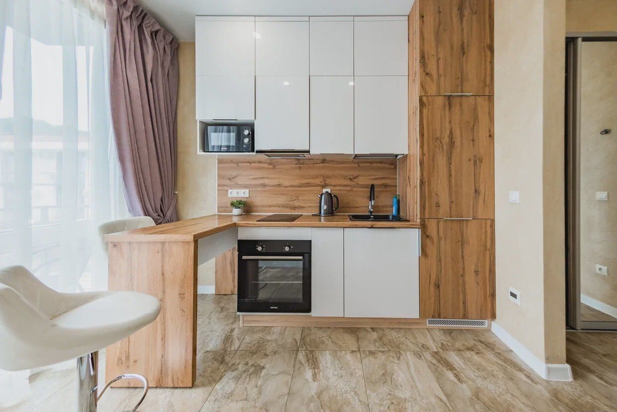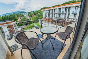Студия для 2-х человек. В квартире имеется все для комфортного проживания: топпер (дополнительный матрас на диван), варочная поверхность, микроволновая печь, холодильник, стиральная машина, сушилка, гладильная доска, утюг, фен, пылесос, посуда и столовые приборы, постельное белье, полотенца. Есть балкон, оборудованный столиком и стульями для комфортного отдыха.