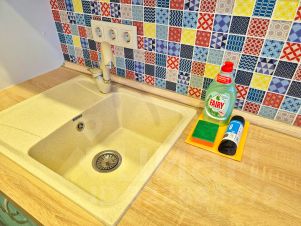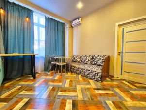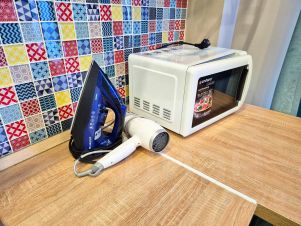 Квартира с отдельной комнатой, размещает 4 человека. Двуспальная кровать, двуспальный диван, телевизор, 2 кондиционера, холодильник, свч, эл чайник, утюг, фен, варочная плита, вытяжка, стиральная машина, сушилка для белья, гладильная доска.
