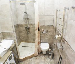 1/5 этаж- лифт, 35 м2, Кухня студия, комната и терраса, размещает 4-5 гостя, санузел - душевая, кровать 2х спальная, диван 2хсп, доп место раскладушка, шкаф, гардероб, стол обеденный, кухонный гарнитур, телевизор 2шт, кондиционер 2шт, WiFi, холодильник, стиральная машина автомат, эл. чайник, свч, газовая плита, утюг, фен, сушилка, гладильная доска. Посуда и постельное белье в полном комплекте.