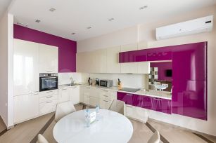 Полностью укомплектованная кухня с бытовой техникой и посудой для приготовления.