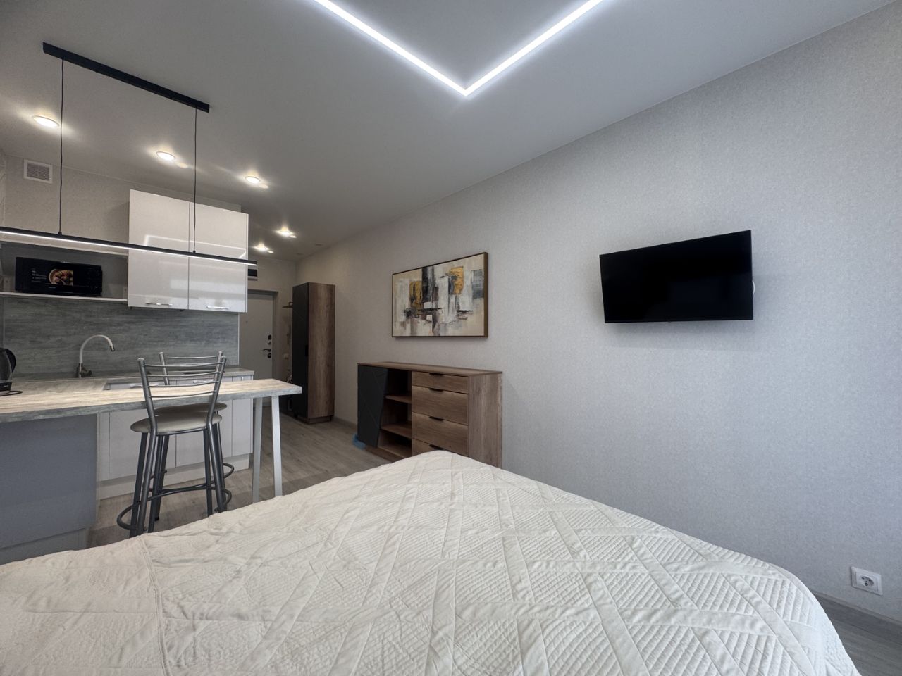В квартире сделан качественный евроремонт: современная отделка, стильные решения и функциональная планировка. Полностью оборудованная кухня с мебелью и техникой, включая холодильник и кондиционер. В комнате также есть необходимая мебель для комфортного проживания. Ванная комната снабжена душевой кабиной, а также стиральной машиной. Для вашего удобства установлен телевизор и проведён интернет.