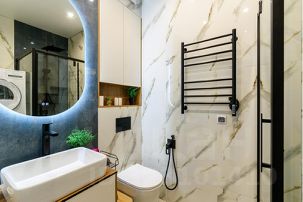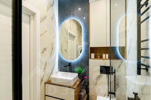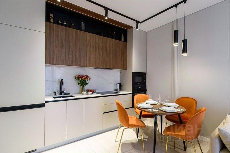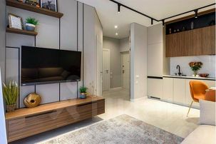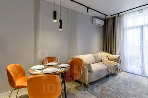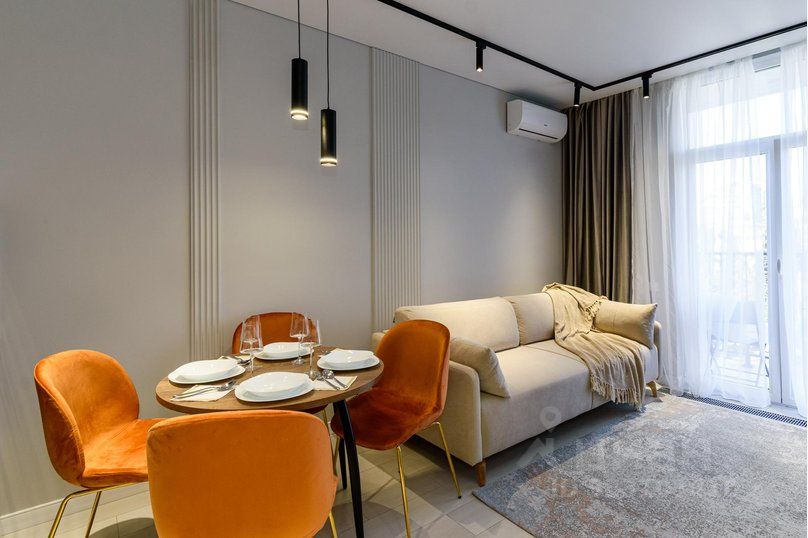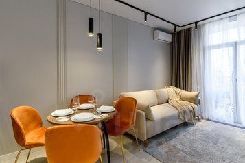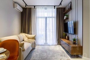 Современная видовая 1 ком квартира рядом с парком Дендрарий. В квартире дизайнерский ремонт, с продуманным эргономичным пространством наполненным красивым декором. В гостиной есть выход на балкон с прекрасным видом на парк Дендрарий. Организована зона отдыха с креслами и столиком.