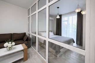 • В спальне кровать, прикроватные тумбочки, шкаф, кондиционер и жалюзи, которыми можно отгородиться от основной комнаты.