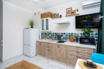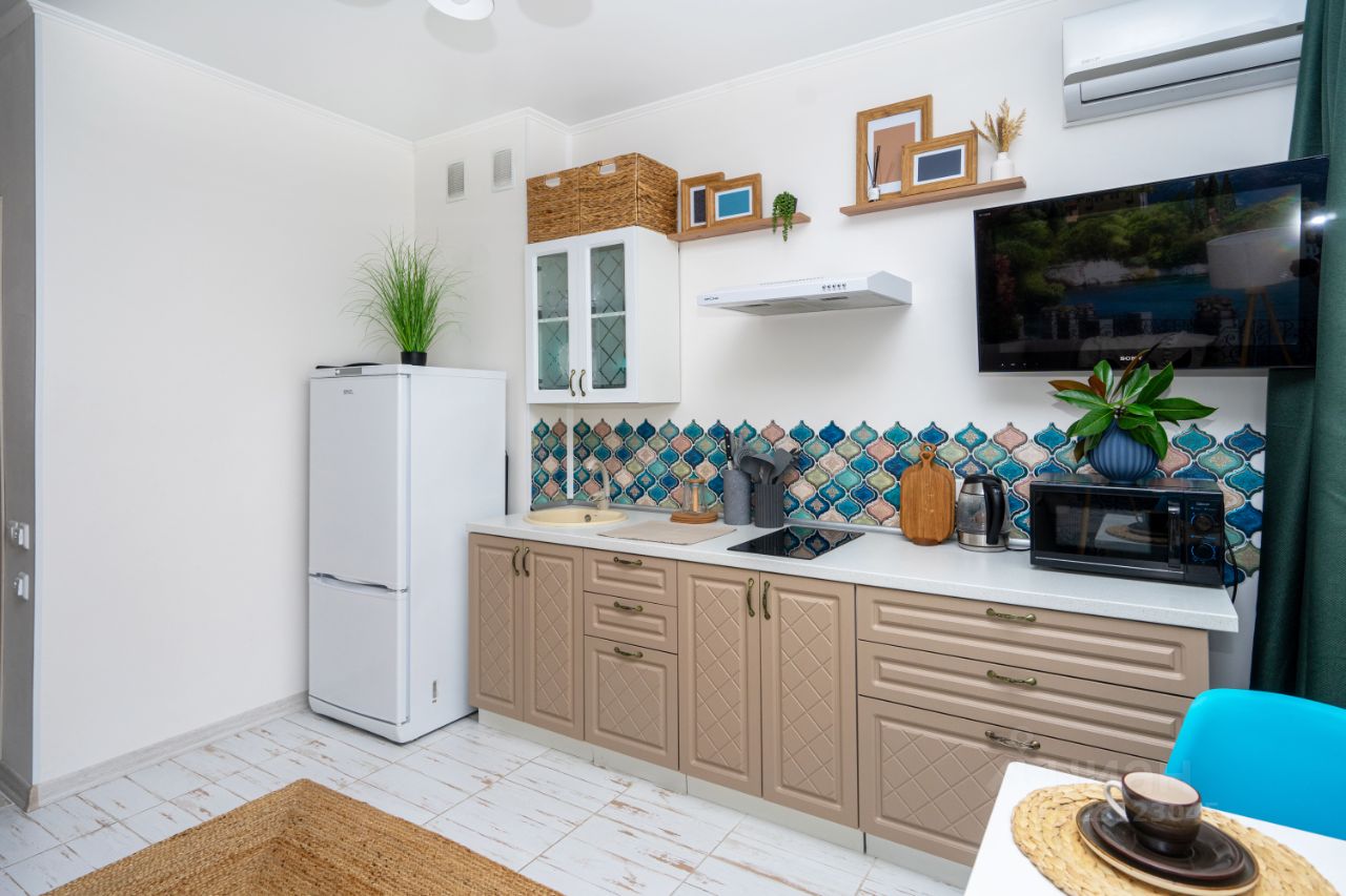 Кухонная зона со всем необходимым: варочная поверхность, чайник, микроволновка, посуда и кухонная утварь;