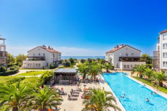 Балкон с видом на море и бассейн станет вашим идеальным местом для утреннего кофе или вечера, наполненного расслабляющими моментами. Наслаждайтесь великолепными пейзажами: солнце, пальмы и ухоженная территория комплекса создадут незабываемую атмосферу.