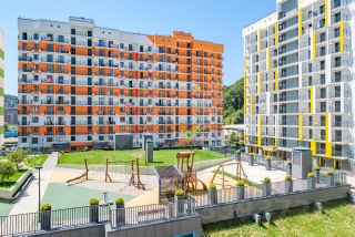 Студия с новым ремонтом, с собственным выходом к речке, с парковкой на территории комплекса и большой детской площадкой.