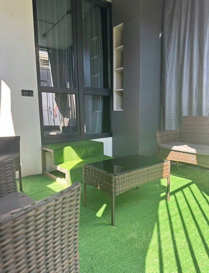 Главное преимущество — терраса 15 м², обеденный стол, озеленение.