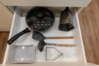 — Барная стойка и стулья, вся необходимая посуда, чайник, микроволновая печь, варочная панель, вытяжка, посудомоечная машина, большой холодильник