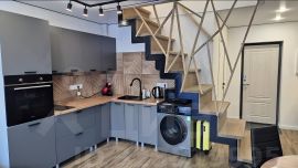 Сдаётся в аренду на зимний период до мая стильная 3-комнатная 2х уровневая квартира с дизайнерским ремонтом, расположенная на первом и втором этаже четырёхэтажного дома. Площадь составляет 66 кв. м. в квартире есть два санузла с душевыми кабинками, что удобно для большой семьи. Окна выходят на улицу, обеспечивая хорошее естественное освещение.