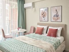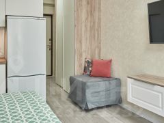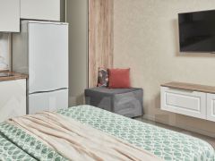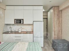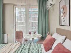Внутри студии выполнен качественный дизайнерский ремонт. В квартире есть вся необходимая мебель как в комнате, так и на кухне. Установлена современная техника: кондиционер, холодильник, телевизор и стиральная машина, поэтому можно сразу заехать и жить с комфортом. В ванной комнате оборудована душевая кабина, а наличие балкона добавляет пространство для отдыха и хранения вещей.