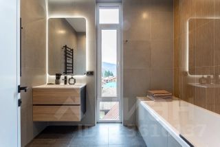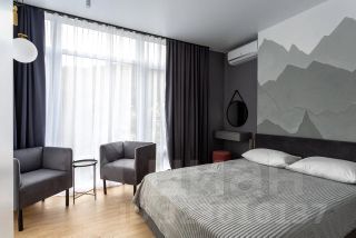 Интерьер выполнен в современном стиле с использованием качественных материалов. Просторная планировка, большие окна и балкон с видом на горы создают атмосферу уюта и гармонии.