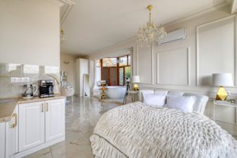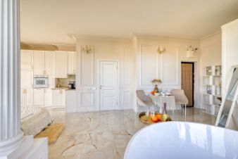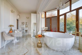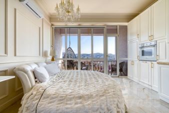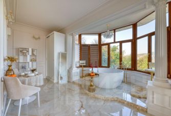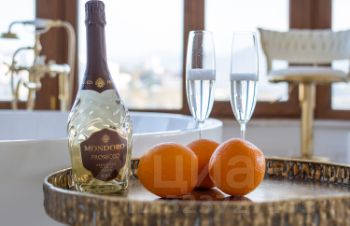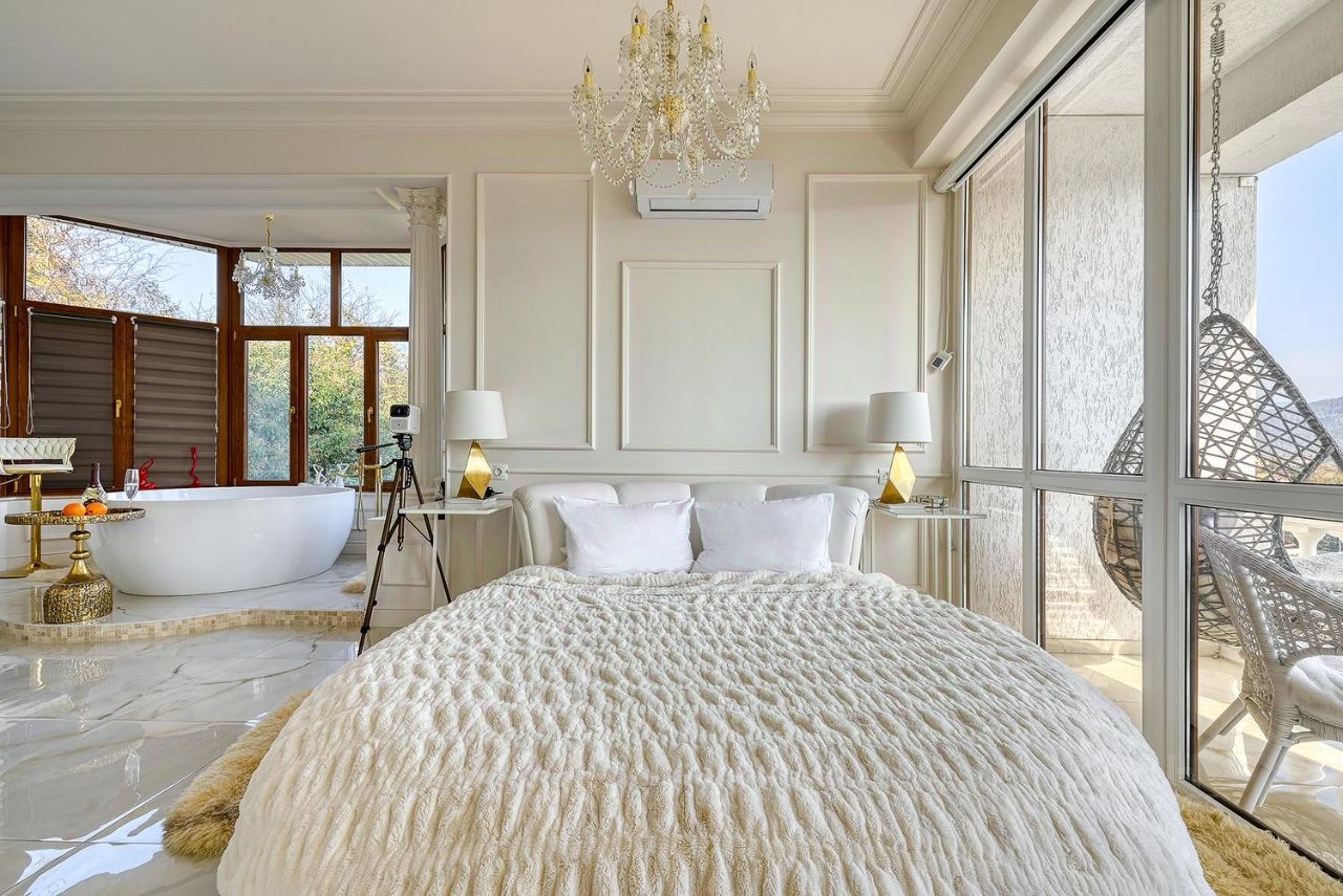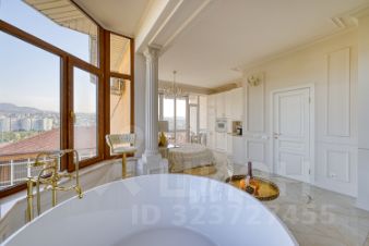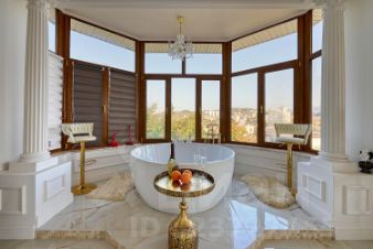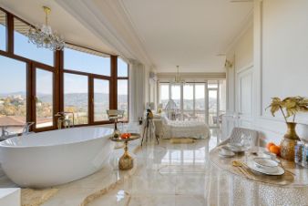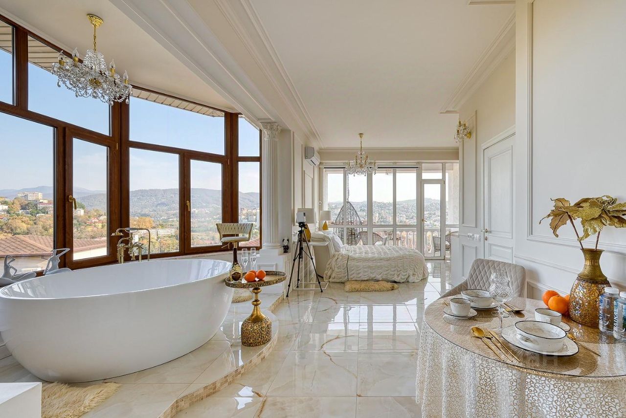 Квартира с дизайнерским ремонтом и уникальной планировкой. В центре внимания — круглая ванна с панорамныйм видом на горы и город.