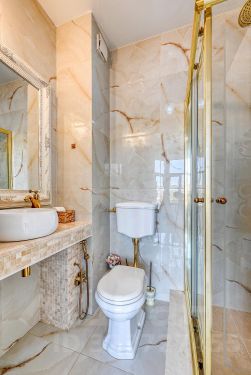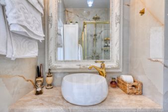 Душевая кабина, дорогая сантехника, халаты и большое зеркало. Уют и комфорт гарантированы.