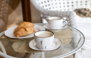 Мебель из ротанга, подвесное кресло кокон и вид на горы, включая вид на заснеженные вершины Красной Поляны.