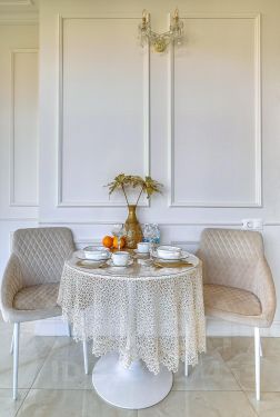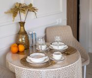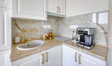 Шкаф-купе, современная кухня с техникой (кофемашина, посудомоечная машина, духовка, холодильник). Всегда есть горячая вода.