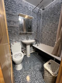 Ванная комната, обои, стены - все в приличном состоянии, что можно увидеть по фото.