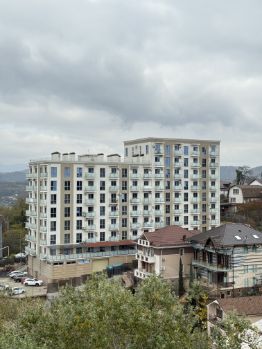 Квартира находится в ухоженном доме с красивой входной группой, выложенной мраморными плитами и обрамлённой туями. Район Бытха — один из самых зелёных в Сочи: тишина, свежесть и простор, при этом до центра и моря легко добраться на транспорте.