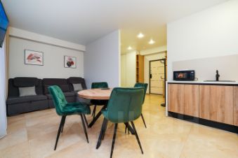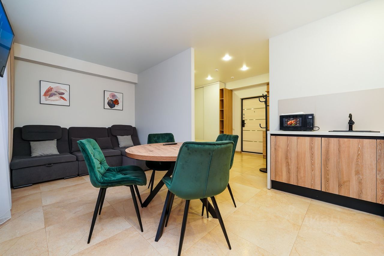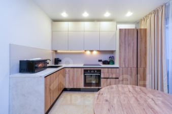 2. Выделенная обеденная зона и оборудованная кухня: холодильник, встраиваемая варочная панель, встраиваемый духовой шкаф, вытяжка, микроволновая печь, чайник, посуда, столовые приборы.