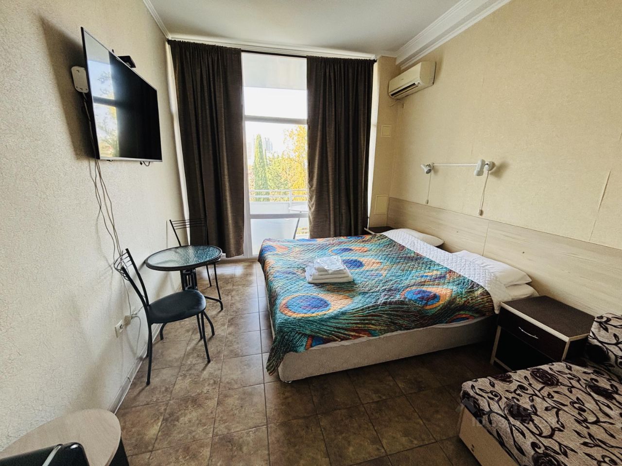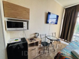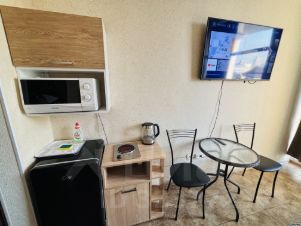 Апартаменты с балконом и видом на море. В студии: двуспальная кровать, односпальный диванчик, кондиционер, микроволновая печь, чайник, ТВ, Wi-Fi, сан.узел, душ. Вместимость до 3х человек. (2+1)