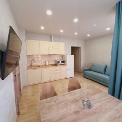 Внутри просторная спальня с двуспальной кроватью, кухня-гостиная с раскладывающимся диваном, прихожая, совмещённый санузел. В каждой комнате есть плазменный телевизор и кондиционер. На кухне имеется необходимая посуда, холодильник, СВЧ, плита, чайник, посудомоечная машина.