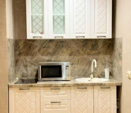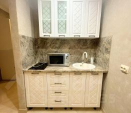 В квартире есть всё необходимое для комфортного проживания. На компактной кухне установлена мебель и техника, включая холодильник и стиральную машину. Жилая зона также обставлена мебелью, а для вашего удобства предусмотрен кондиционер и телевизор. Санузел совмещённый, оборудован душевой кабиной.