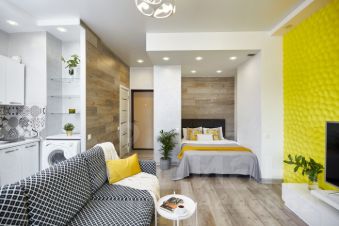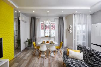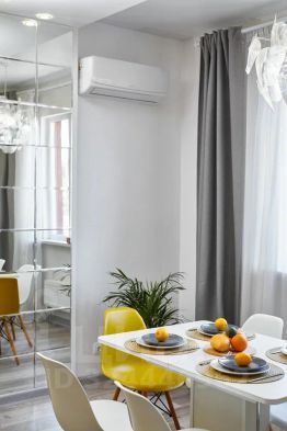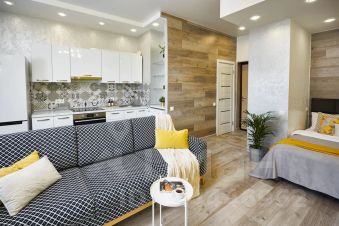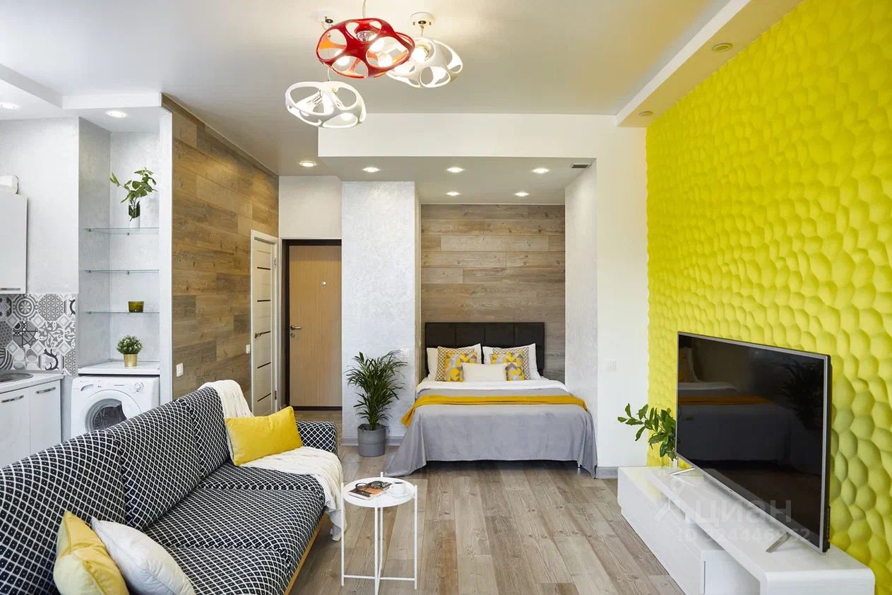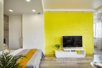 В этой студии сделан стильный дизайнерский ремонт. Квартира полностью меблирована и оснащена необходимой техникой: кондиционер, холодильник, телевизор и стиральная машина. Ванная комната оборудована душевой кабиной. Всё это создаёт атмосферу уюта и позволяет сразу же въехать без дополнительных хлопот.