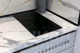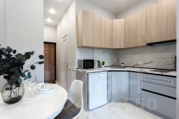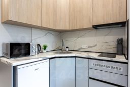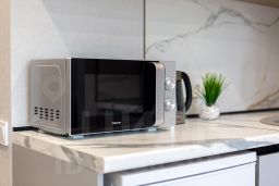 Кухня с полным набором принадлежностей: чайник, электрическая плита и микроволновая печь.