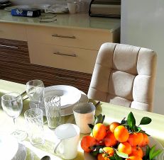 В кухне новый неисполльзованный комплект посуды и столовых приборов, новая микроволновка.