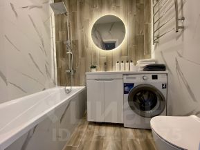 Кухонная зона с обеденным столом, санузел с ванной и стиральной машиной.