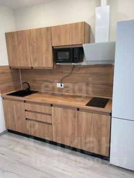 Современную кухонную зону с полноценной комплектацией: варочная поверхность, вытяжка, холодильник, чайник и микроволновка.