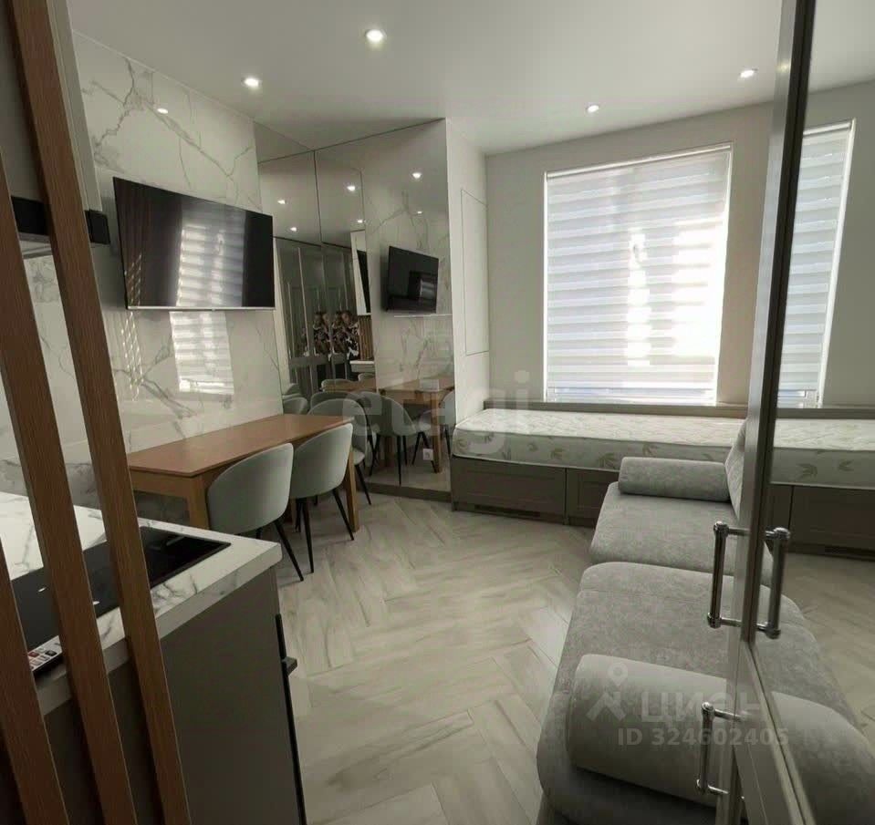 Сдается студия площадью 17 кв. м в жилом комплексе "Сочи Парк". Помещение выполнено в светлых тонах, что создает ощущение простора и уюта.