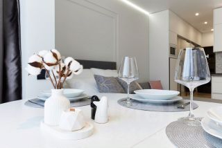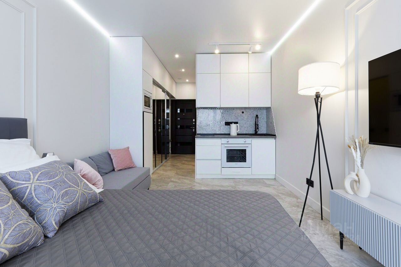 Студия выполнена в современном неоклассическом и минималистичном дизайне. Грамотная эргономика, продуманная до мелочей: