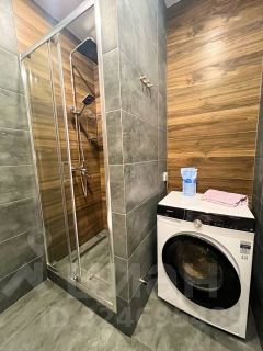 В квартире сделан дизайнерский ремонт, что придаёт ей стильный и современный вид. Пространство продумано до мелочей: кухня оборудована всей необходимой мебелью и техникой, включая холодильник и кондиционер. В комнате также есть вся необходимая мебель для комфортного проживания. Ванная комната оснащена душевой кабиной. Для вашего удобства в квартире также есть стиральная машина и телевизор.