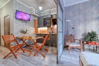 Квартира оснащена необходимым для проживания. Имеются: двуспальная кровать с ортопедическим матрасом, двуспальный диван, обеденная зона и посуда, холодильник, микроволновая печь, газовая плита, вытяжка, газовый котёл, телевизор, кондиционер, гладильная доска, фен, утюг, пылесос, сушилка. Предоставляются постельное бельё и полотенца, гель, шампунь, кондиционер. Есть кладовая.