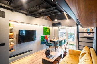В квартире есть отдельная спальня с полноценной двухспальной кроватью, кухня-студия с витражным остеклением (вечером можно наблюдать красивейшие закаты) и диваном, а сверху антресоль, где могут расположиться для сна еще двое (два матраца 90х200 каждый).