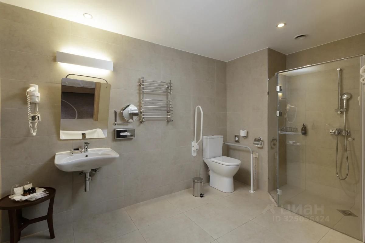 Просторный однокомнатный люкс с большой двуспальной кроватью. Для комфортного пребывания маломобильных гостей номер дополнительно оборудован поручнями и кнопкой вызова персонала. Вид из номера открывается на внутренний двор. Фотографии данной категории носят ознакомительный характер, планировка, площадь и комплектация номера могут отличаться от представленного на фото, в зависимости от конкретного номера.