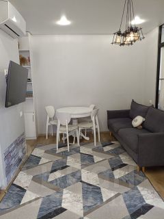 Сдаётся уютная, светлая квартира, с ремонтом и всей необходимой для проживания мебелью и техникой. Квартира подойдёт для проживания супружеской пары с ребенком. Спальня и детская имеют собственные окна и огорождены от кухни-гостинной стеклянными перегородками.