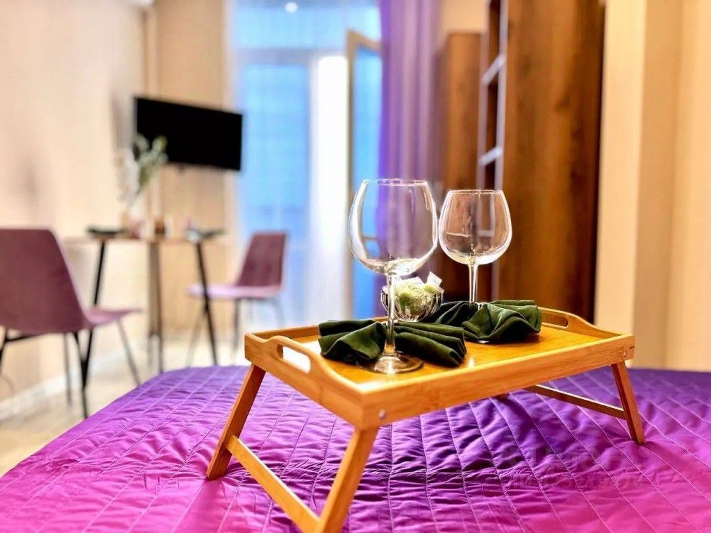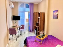 Студия рассчитана на двух гостей. Мебель: двухместная кровать, шкаф и обеденный уголок. В распоряжении гостей: оборудованная кухонная зона с бытовой техникой, микроволновой печью, электрическим чайником, посудой и столовыми приборами. Аксессуары для комфорта: постельное бельё, гигиенические средства, полотенца, Wi-Fi и телевизор. Санузел оснащён душевой кабиной и умывальником.