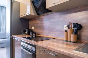 Уютные апартаменты площадью 42 кв.м. в выдержанных тонах с балконом, панорамными окнами с одной двуспальной кроватью и дополнительным местом (двуспальный диван), для одно, двух-, трех-, четырехместного размещения. Апартаменты оснащены кондиционером, телевизором с плоским экраном, утюгом, гладильной доской. А так же современным кухонным гарнитуром с духовым шкафом, мойкой, плитой, современной бесшумной вытяжкой, холодильником, СВЧ, электрическим чайником и посудой необходимой для комфортного проживания как на короткое время, так и длительный срок. Собственная просторная ванная комната с душем укомплектована феном, стиральной машиной и туалетно-косметическими принадлежностями.