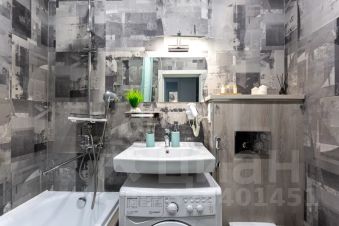 Санузел с ванной, раковиной с зеркалом, унитазом и стиральной машиной.