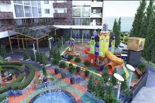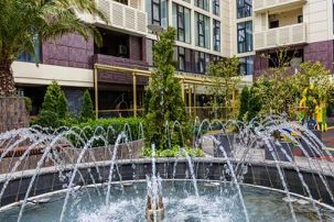 - Нижнюю платформу с подвесными качелями, свежим фонтаном, основной детской площадкой, а также зоной ожидания на улице и внутри зоны ресепшен. На всей территории ЖК высажены зелёные насаждения, приветствуется - эко и оздоровительный отдых.